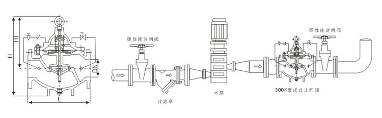 當(dāng)從進(jìn)口端給水時(shí),水通過(guò)微型過(guò)濾器、針閥、單向閥進(jìn)入主閥控制室,再經(jīng)過(guò)球閥排水至下游。因?yàn)獒橀y開(kāi)度小于球閥開(kāi)度,即主閥控制室的排水速度大于進(jìn)水速度,因此控制室壓力降低,作用于主閥盤(pán)下端的進(jìn)口壓力打開(kāi)主閥向下游供水。 當(dāng)管道停止供水時(shí),若下游水開(kāi)始回流,一部分回流水經(jīng)球閥進(jìn)入主控制室,由于單向閥作用,回流水不能從主控制室流出,引起主控制室逐漸升壓,緩緩關(guān)閉主閥。